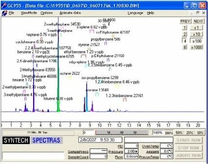SYNTECH SPECTRAS GC955 811 осуществляется по полунепрерывному принципу, что позволяет избежать скачков показаний и обеспечивает стабильность и надежность результатов. Продолжительность цикла измерений 30 минут. Углеводороды концентрируются на охлаждаемом улавливателе, достигая порогового значения концентрации. Для измерений используются два детектора: фотоионизационный (PID) и пламенно-ионизационный (FID). При этом ненасыщенные углеводороды регистрируются с помощью PID, насыщенные - с помощью FID. Это позволяет легко идентифицировать вещества. Чувствительность PID к ненасыщенным углеводородам очень высока, что обусловлено их высокой склонностью к образованию озона.